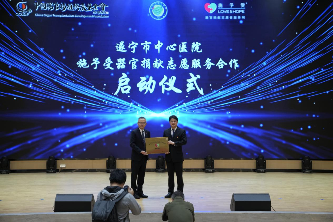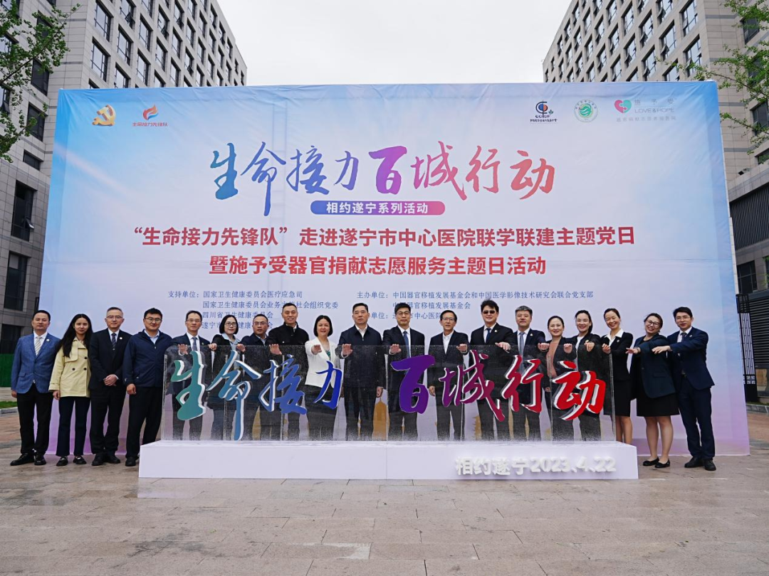 4月22日,在国家卫生健康委员会医疗应急司、国家卫生健康委员会业务主管社会组织党委、国家卫生健康委员会党校、四川省卫生健康委员会、遂宁市委市政府、中国市长协会指导支持下,中国器官移植发展基金会、北京爱尔公益基金会共同在四川遂宁启动首站“生命接力 百城行动”系列活动。国家卫生健康委党校常务副校长、国家卫生健康委业务主管社会组织党委书记许培海,中国器官移植发展基金会和中国医学影像技术研究会联合党支部书记、中国器官移植发展基金会理事长赵洪涛,中国器官移植发展基金会秘书长蒲苗,中国市长协会女市长分会副秘书长、北京爱尔基金会秘书长张碧波,四川省卫生健康委副主任、党组成员、一级巡视员宋世贵,四川省卫生健康委医政医管处处长李冰,遂宁市委常委、秘书长陈晓波,遂宁市人民政府副市长吴新春、副秘书长谭恢军,遂宁市文明办副主任何姗,遂宁市卫生健康委员会主任潘昀,华中科技大学同济医学院附属同济医院教授陈忠华,以及遂宁市相关市直部门代表、医院相关领导,医院医护人员500余人参加了活动。