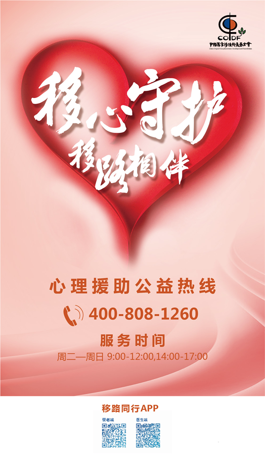 自2020年3月10日起,中国器官移植发展基金会开通“移”心守护器官移植心理援助公益热线“400-808-1260”,为广大移友、移友家属、捐献者家属、协调员及移植医护人员提供免费心理咨询服务,开展心理指导和干预工作。